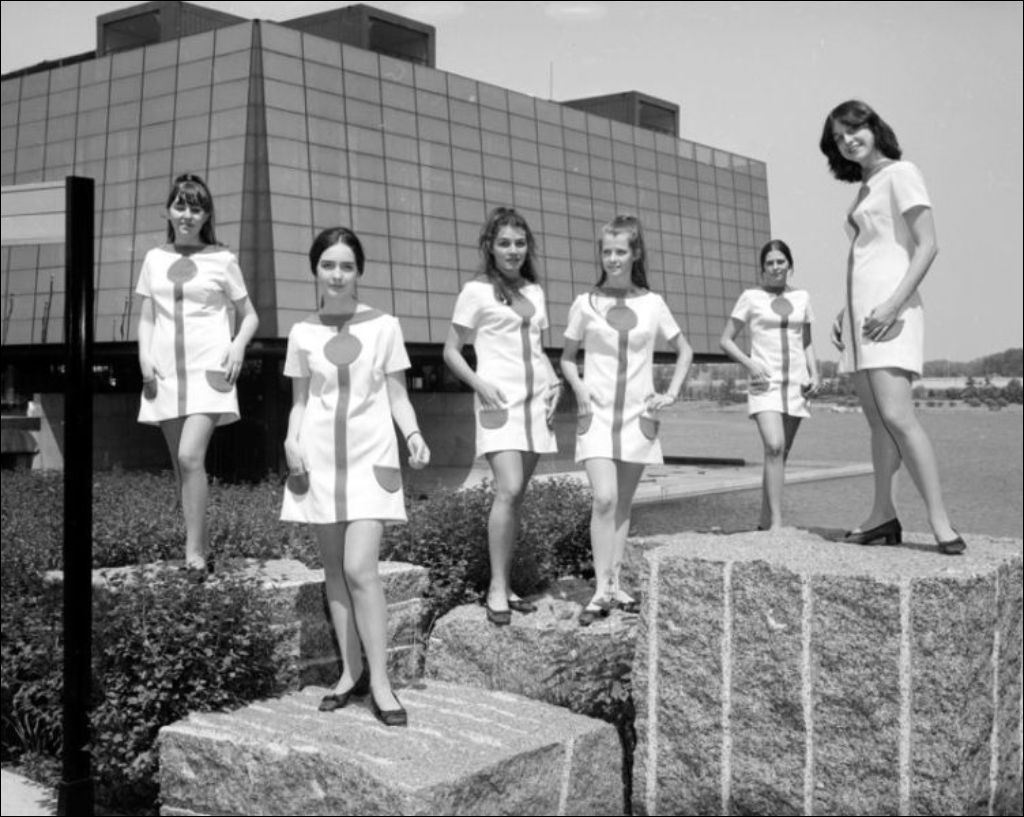 Costume des hôtesses du pavillon du Québec, 1970, Archives nationales à Montréal, Fonds Ministère de la Culture et des Communications, (06M,E6,S7,SS1,D701559-701559), Henri Rémillard.