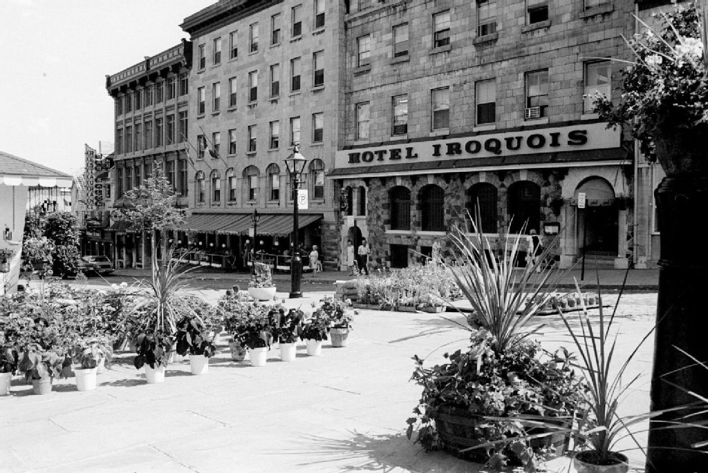 - Façade de l'édifice, kiosque de fleurs et jeunes assis à la terrasse de l'hôtel. Dossier commandé par M. Lefebvre de l'Office franco-québécois pour la jeunesse