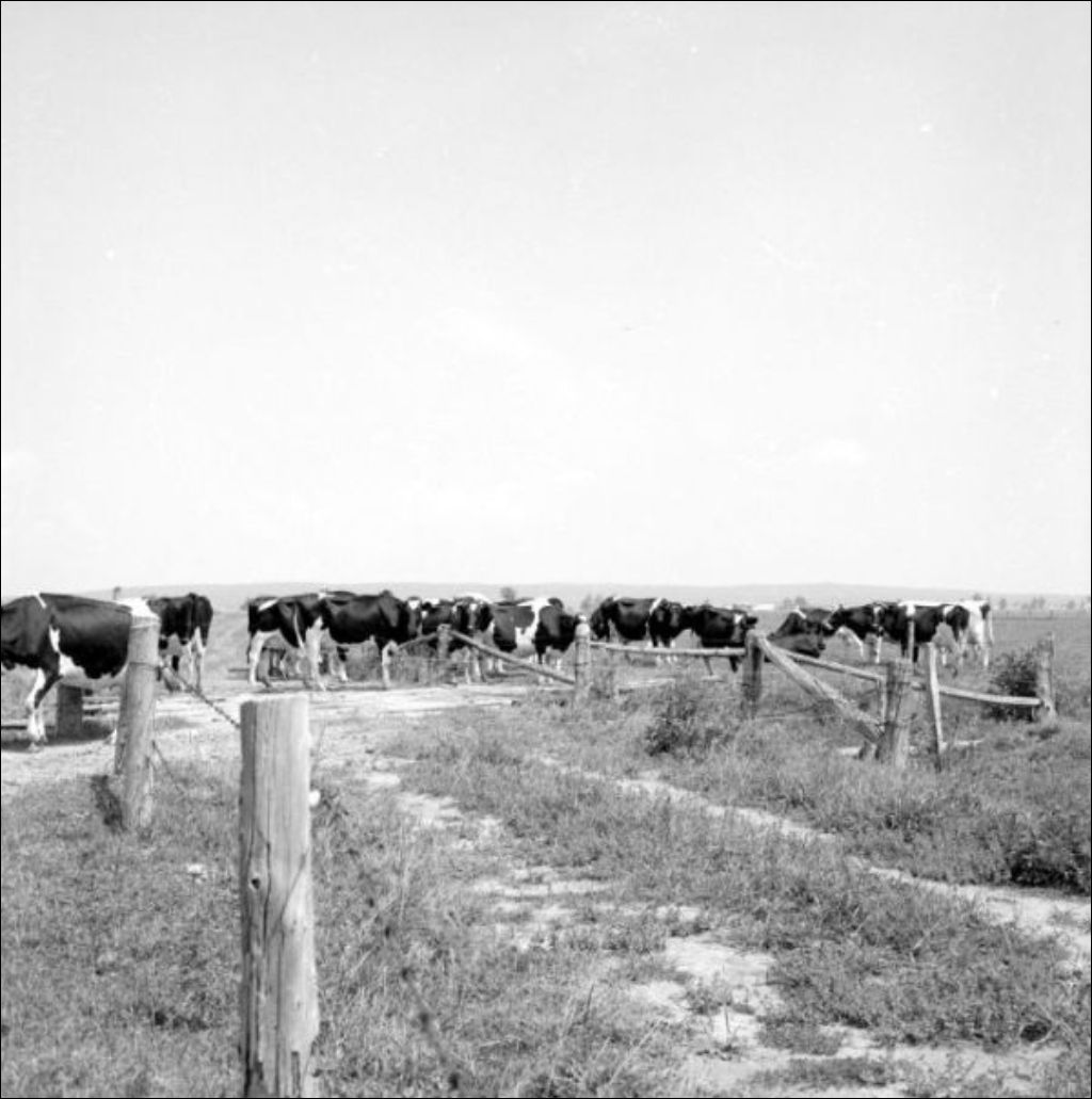 - On remarque la famille devant la maison, les bâtiments de la ferme, le jardin, le troupeau de vaches et le champ de maïs