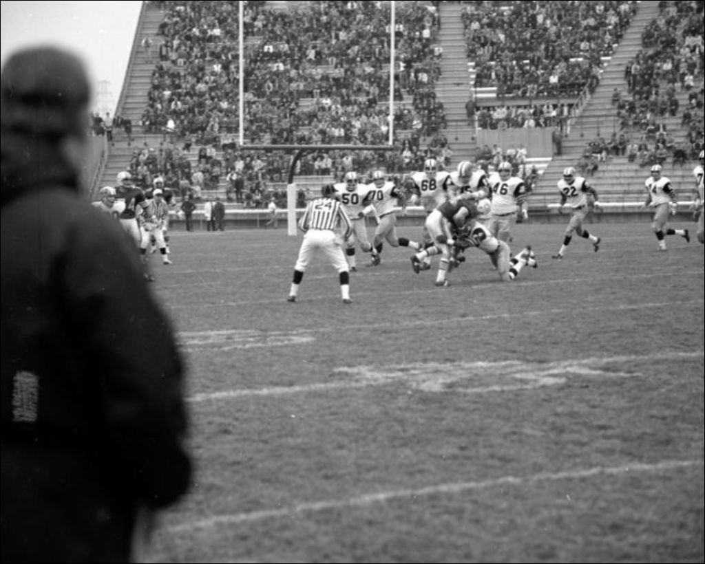 - Ces images témoignent d'un match de football entre les Alouettes de Montréal et les Tiger Cats d'Hamilton. Nous remarquons les joueurs, les arbitres, les meneuses de claques et la foule. Marc Hardy du ministère du Tourisme, de la Chasse et de la Pêche a commandé ces clichés