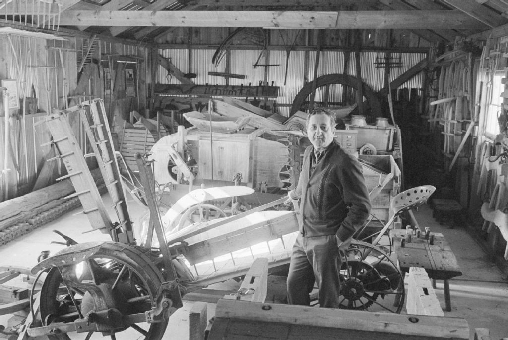 Robert Lionel Séguin est photographié chez lui. On remarque une collection d'objets anciens composés principalement de matériel agricole (faux, pelles, attelage, etc.), d'outils (haches et rabots) et d'articles de cuisine (bouilloires, moules, tamis, etc.). Clichés demandés par Claude Haeffely du ministère des Affaires culturelles, Service de la Bibliothèque nationale du Québec