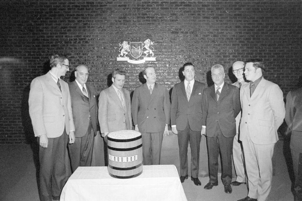Signature d'un contrat à la compagnie Melchers Distilleries Limited à Berthierville, 1971, Archives nationales à Montréal, Fonds Ministère de la Culture et des Communications, (06M,E6,S7,SS1,D710380-710380), Adrien Hubert.