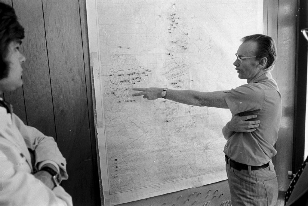 - Un cameraman filme une entrevue accordée par des chercheurs. On peut voir les étapes de l'arrosage : les expériences et les tests en laboratoire, le résultat produit sur les végétaux et l'arrosage aérien. Ces images ont été demandées par M. G. Langlois du ministère des Terres et des Forêts, Service de l'information