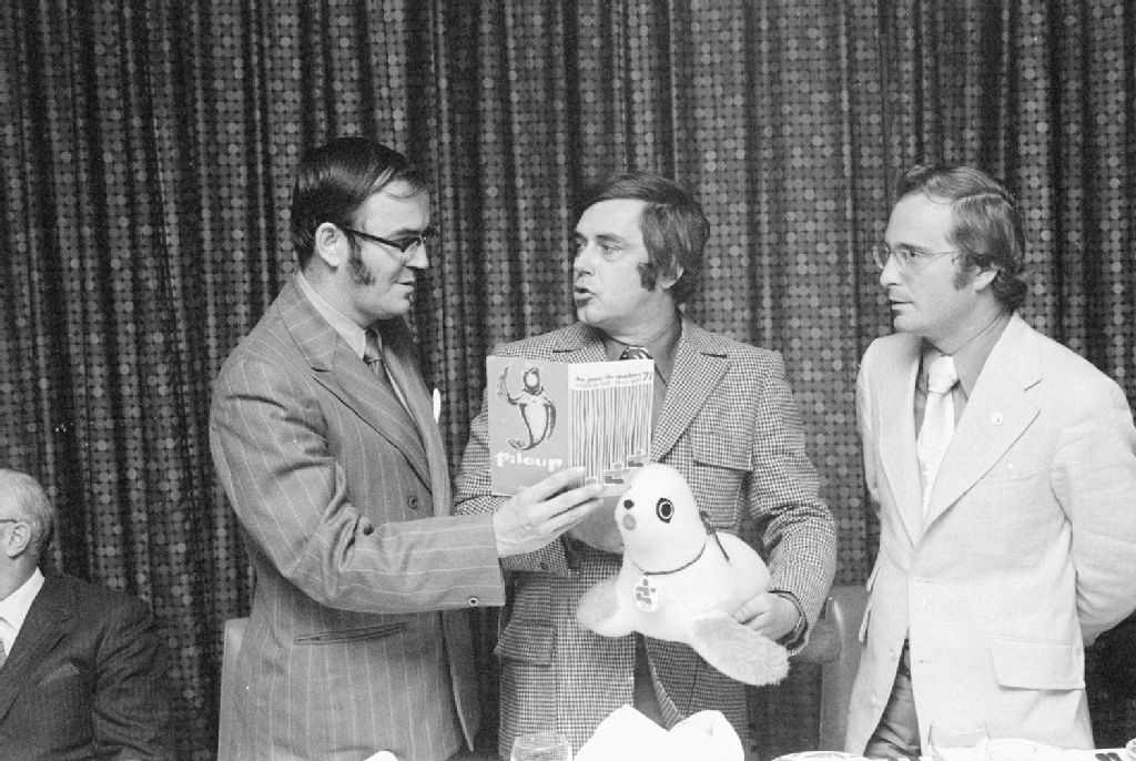 M. Houde et ses collègues présentent un dépliant intitulé Jeux du Québec de 1971. Un phoque en peluche appelé Piloup est utilisé comme emblème des Jeux. Cette image a été demandée par Thérèse Masson du ministère des Communications, Service de l'information