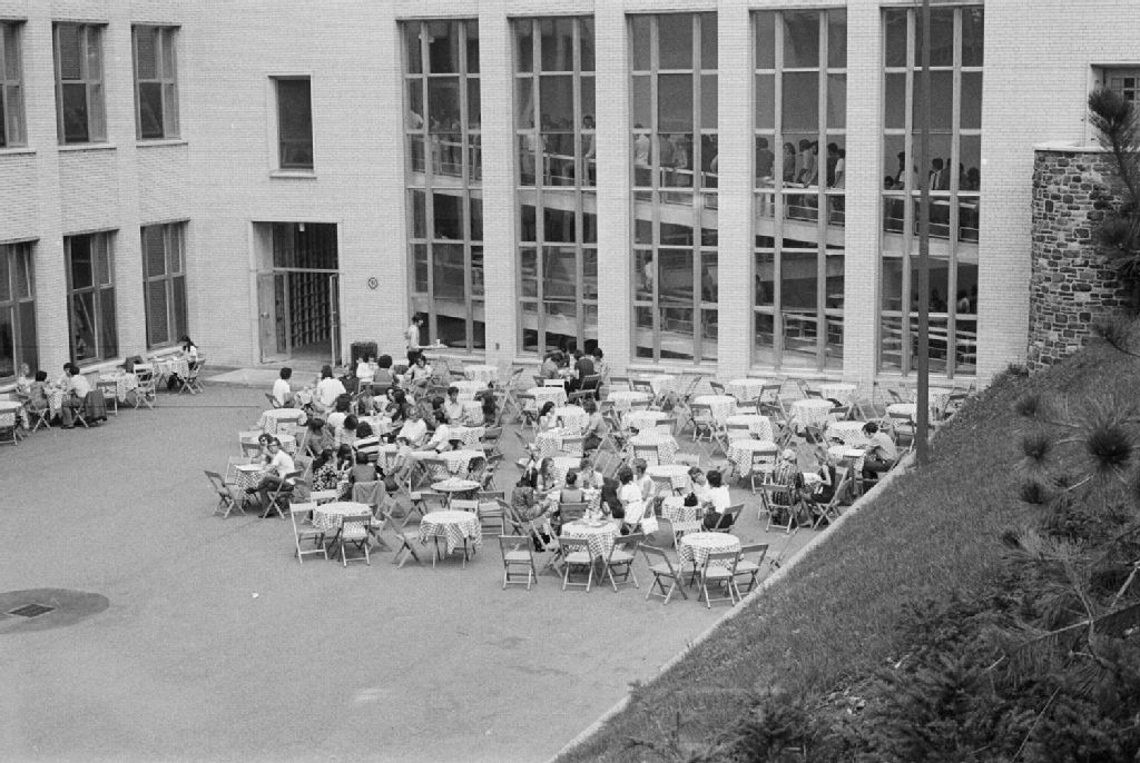 - On peut voir des étudiants attablés au centre social, une navette stationnée et des jeunes distribuant des documents en plein air. Il s'agit probablement de la revue «Éducation Québec». Images commandées par Lise Trudel du ministère des Communications, Office de l'information et de la publicité