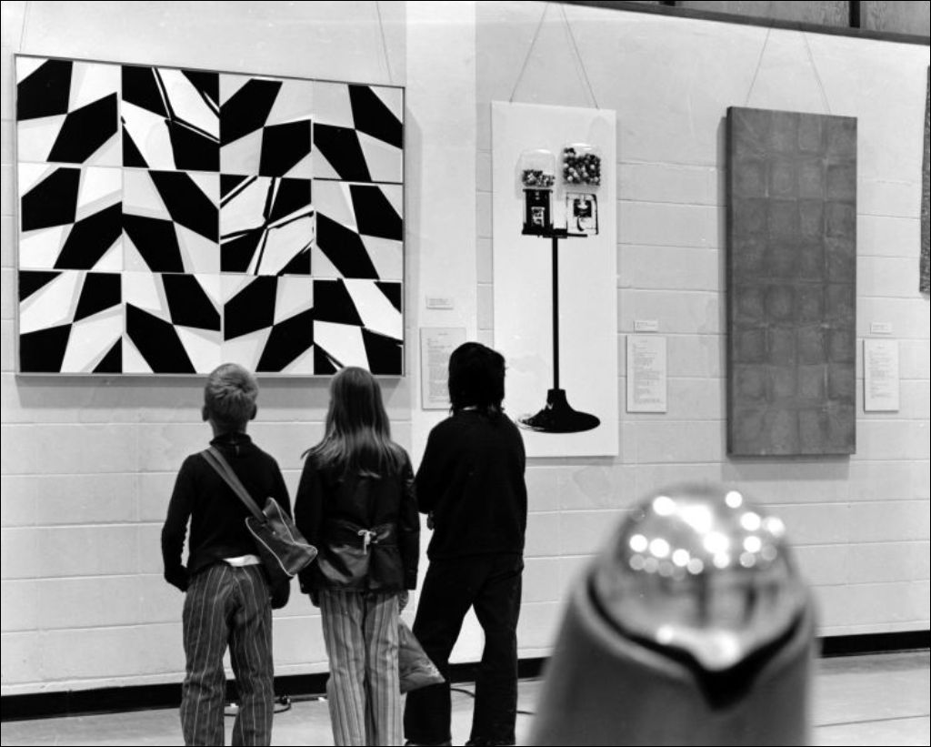 «Exposition des créateurs du Québec» à Noranda, 1971, Archives nationales à Montréal, Fonds Ministère de la Culture et des Communications, (06M,E6,S7,SS1,D711693-711709), Photographe non identifié.