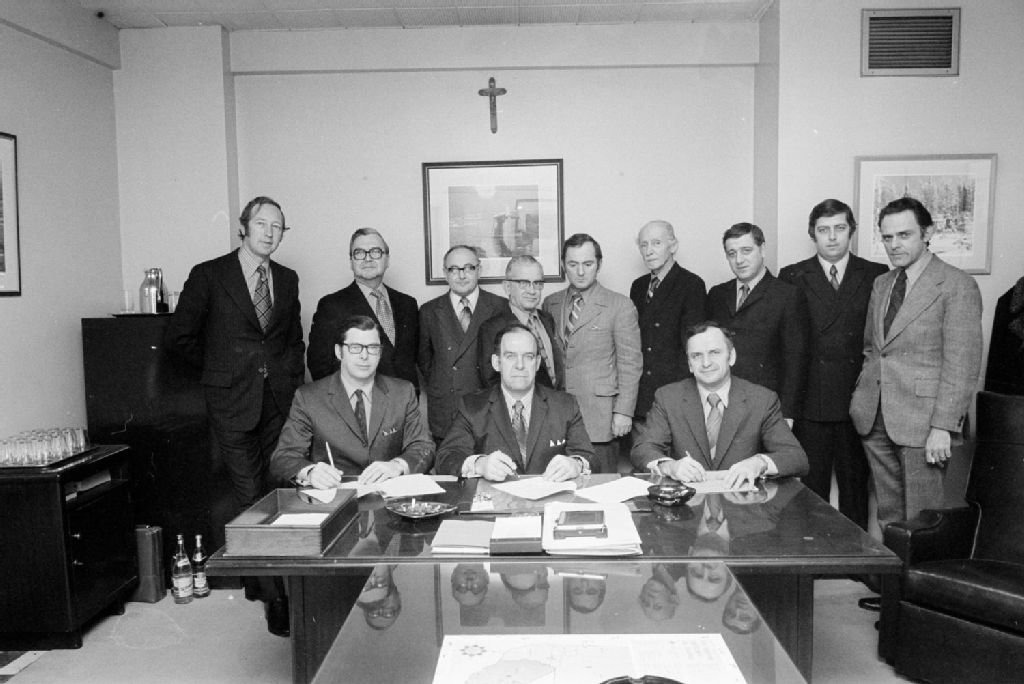 Signature d'une entente avec la Régie des marchés agricoles, 201, rue Crémazie est, Montréal, 1971, Archives nationales à Montréal, Fonds Ministère de la Culture et des Communications, (06M,E6,S7,SS1,D712683-712683), Gabor Szilasi.