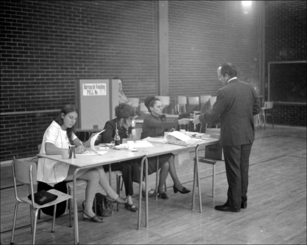 - Les électeurs se présentent au bureau de votation. On remarque la file d'attente, les préposés à la liste électorale et le tableau des résultats. Images commandées par M. Melançon du ministère des Communications, Service de l'information