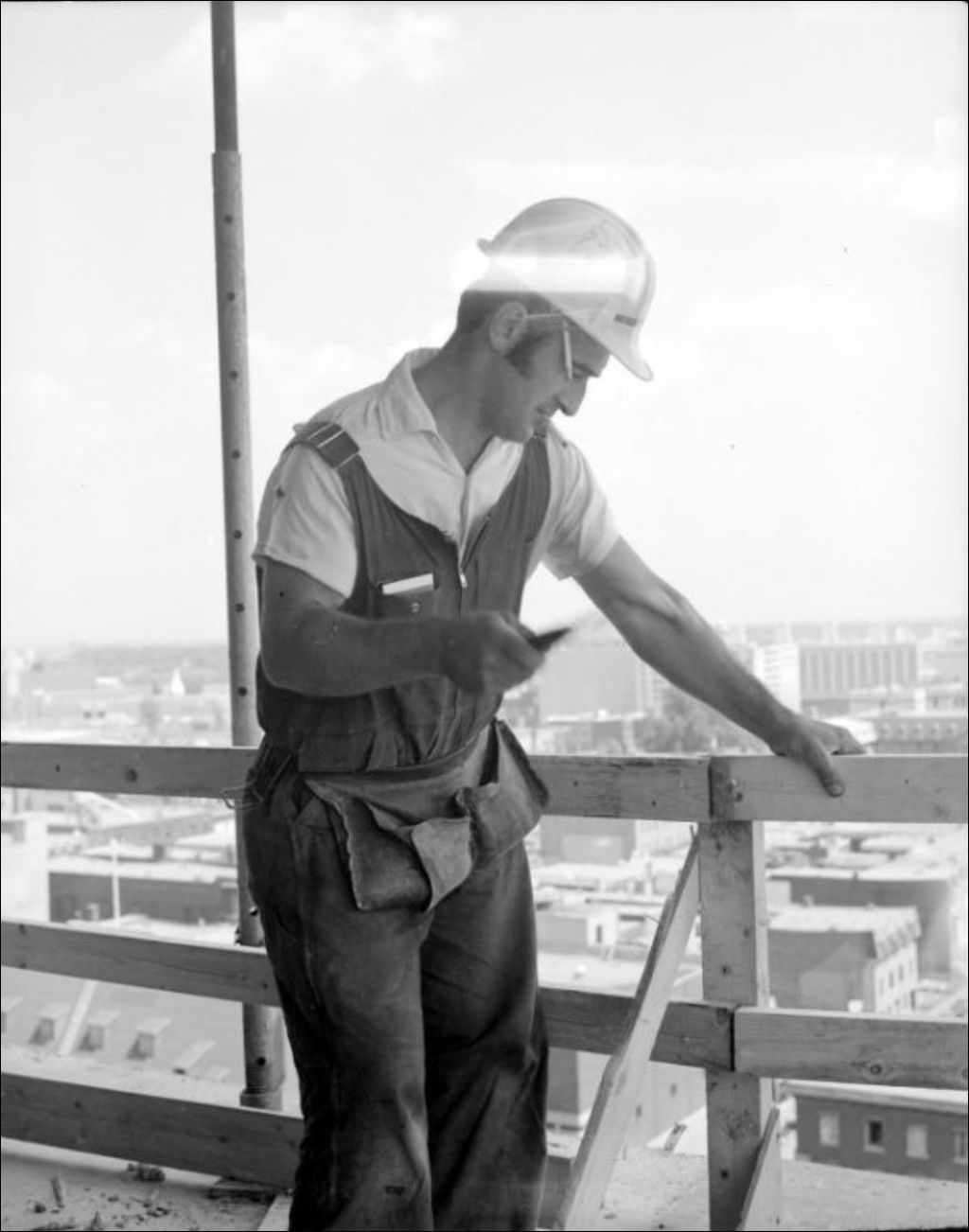 - Souvent installés sur des échafaudages, les ouvriers sont affairés aux tâches de menuiserie, de plomberie et d'électricité. Les images montrent aussi des grues à tour, des chargeuses frontales, des camions à benne et une boîte d'explosifs utilisés pour le dynamitage. Images demandées par M. Dostaler du ministère du Travail