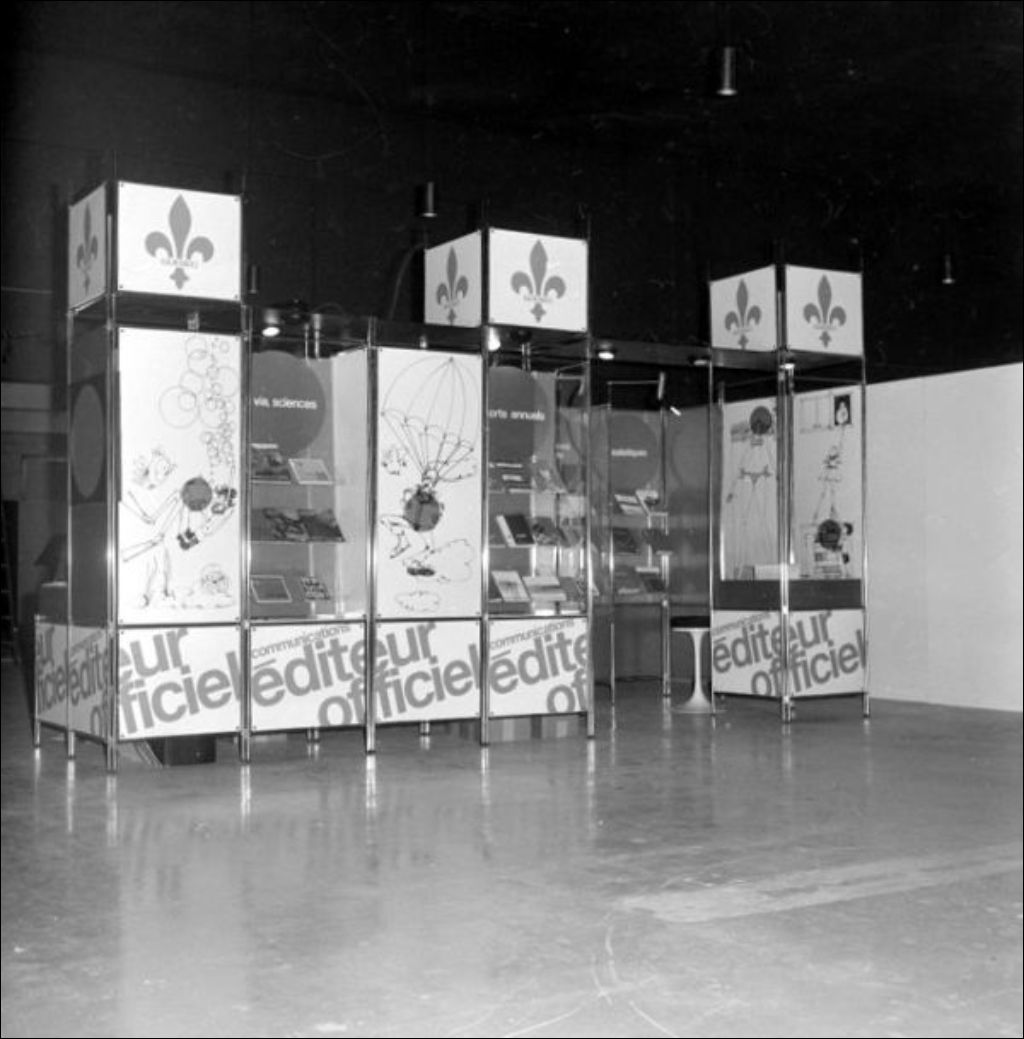 Kiosque de l'Éditeur officiel du Québec. Palais du commerce. Montréal, 1972, Archives nationales à Montréal, Fonds Ministère de la Culture et des Communications, (06M,E6,S7,SS1,D721752-721753), Claude Gosselin.