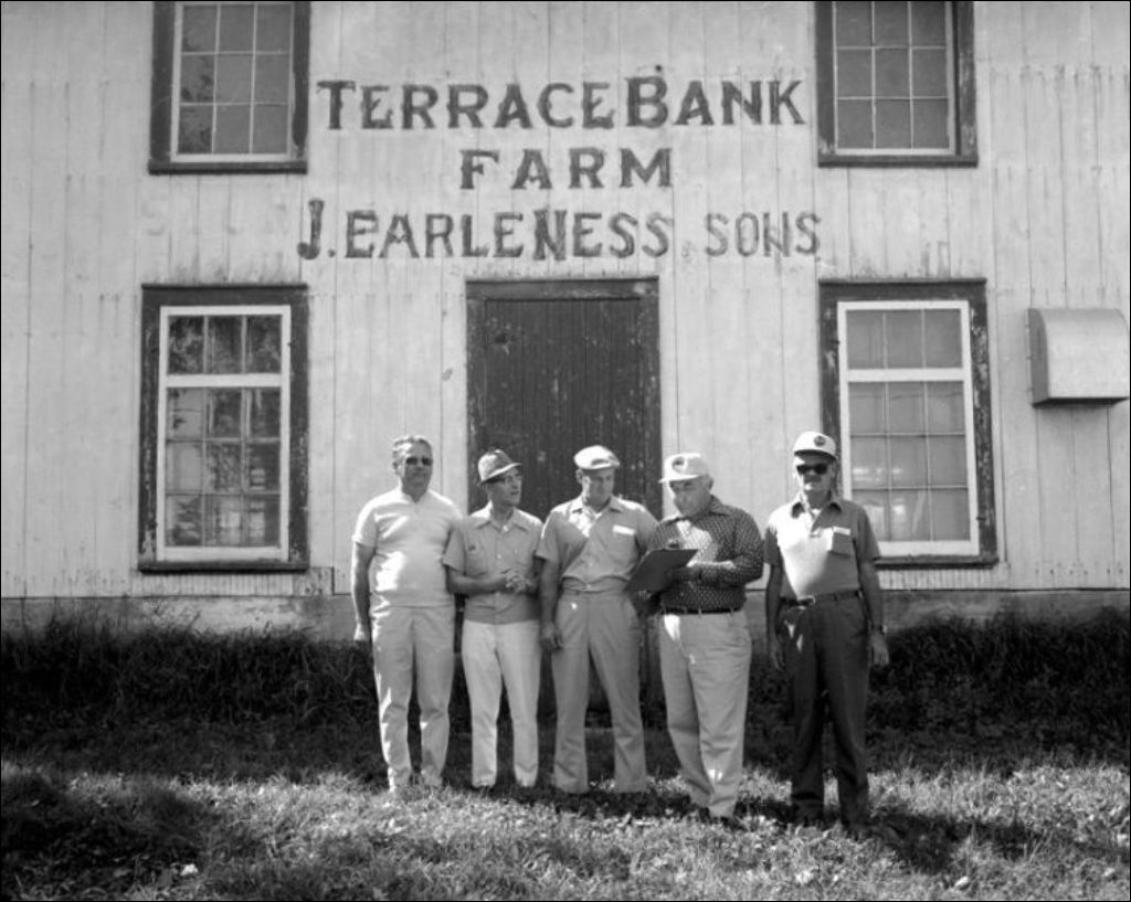 Groupe en visite à la ferme Terrace Bank Farm J. Earleness Sons pour une séance d'information. De plus, nous apercevons le groupe dans les champs de maïs constatant les bienfaits de l'emploi d'engrais. Photographies prises à la demande de Jacques Saint-Hilaire du ministère de l'Agriculture, Service de l'information
