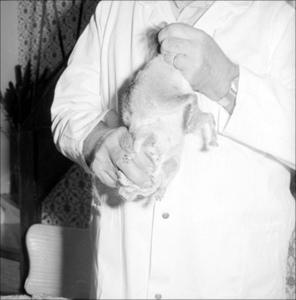- L'éleveur abat et dépouille l'animal de sa peau. On nous montre également un manchon et un chapeau faits de fourrure de chinchillas. Clichés réalisés pour François Garon du ministère de l'Agriculture, Service de l'information