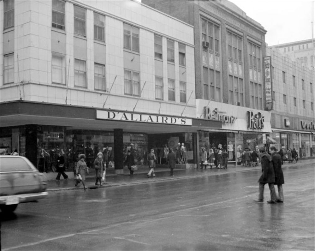 Ces photographies montrent différents commerces du centre-ville de Montréal : Simpsons, D'Allaird's, la Banque canadienne nationale, le poste de radio CJMS et enfin l'édifice des Pêcheurs unis du Québec. Images commandées par Réal Pelland du ministère de l'Agriculture, Service de l'Information