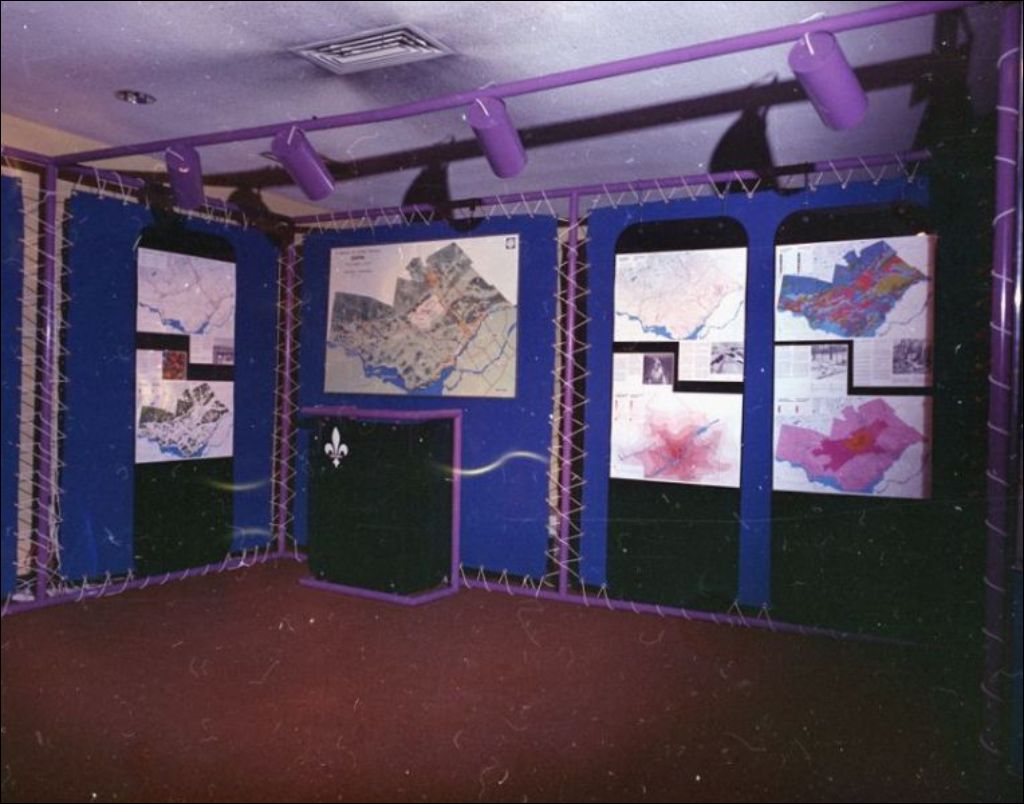 - Kiosque du Service d'aménagement du territoire de la région aéroportuaire (SATRA), exposé à la Maison du commerce situé sur la côte du Beaver Hall à Montréal. Images commandées par Roch Lessard du ministère des Affaires municipales, Service de l'information