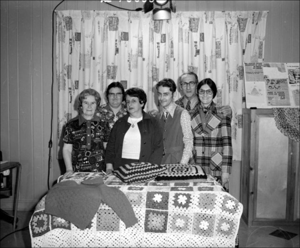 - Gens travaillant sur des métiers à tisser (basse lisse) et présentant certaines de leurs réalisations. Photographies prises à la demande de Michèle Josse du ministère de l'Éducation, Service du Multi-média