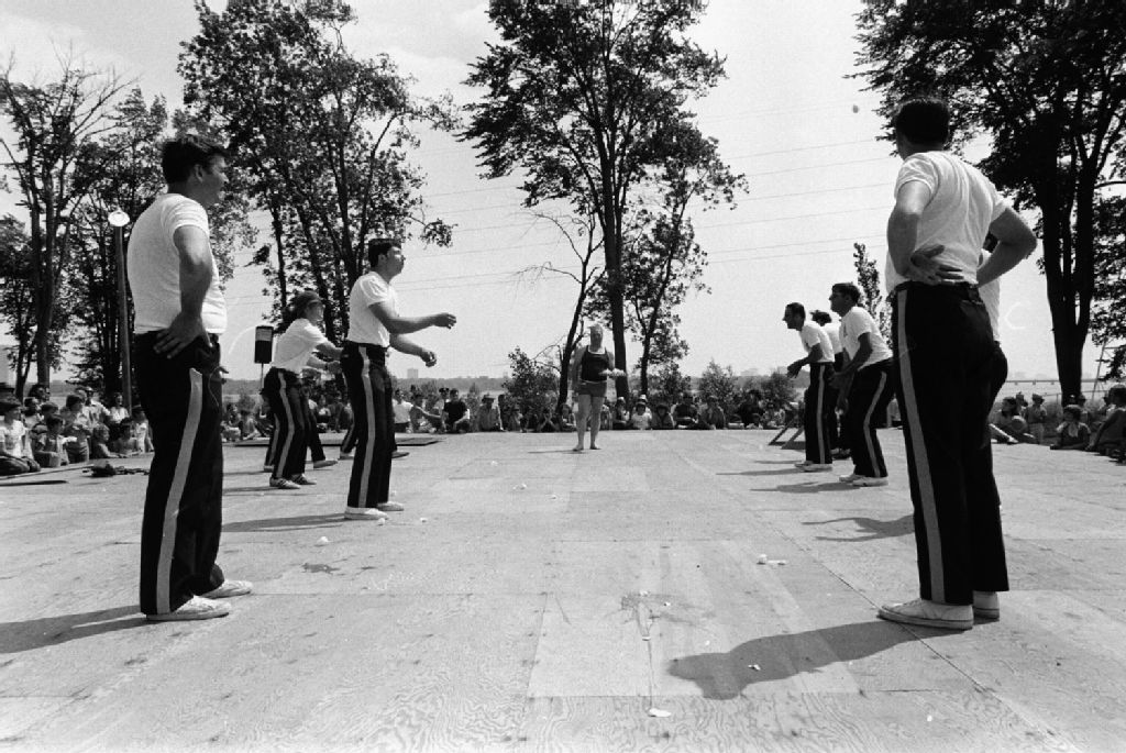 - Compétition de sciage de bois et de saut en parachute. Un jeune sportif allume le flambeau des Jeux du Québec en Outaouais. Images commandées par Martin Pronovost du ministères des Communications