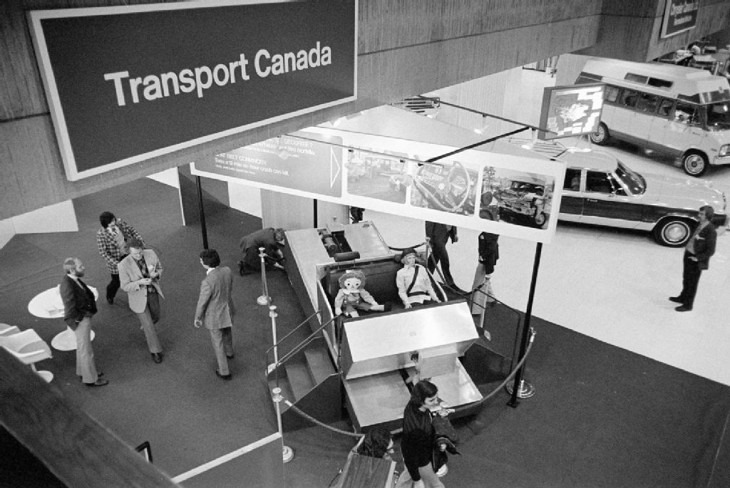 - Nous remarquons la présence du ministre d'État aux Transports, Paul Berthiaume. Nous voyons aussi le stand du ministère des Transports et des voitures de marque Chrysler, Toyota, Renault et Oldsmobile. Photographies commandées par Ginette Danis du ministère des Transports, Service de l'information