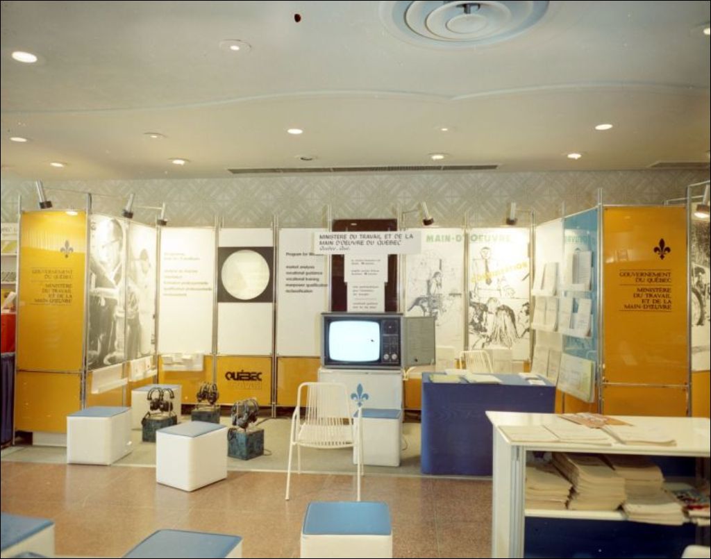 - Ces images montrent le kiosque du ministère du Travail et de la Main-d'oeuvre présenté à l'occasion du 18e Congrès international de psychologie appliquée qui a eu lieu à l'hôtel Reine Elizabeth de Montréal. Clichés demandés par Armand Mercier du ministère du Travail et de la Main-d'oeuvre, Service des communications