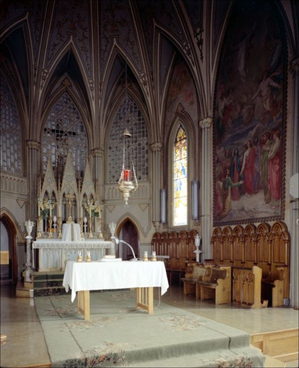 - Les images de ce dossier illustrent l'intérieur de l'église de Saint-Hilaire et plus particulièrement la chaire et l'autel. La décoration de l'église à été réalisée par l'artiste Ozias Leduc. Photographies prises à la demande de Paul Girard du ministère des Affaires culturelles
