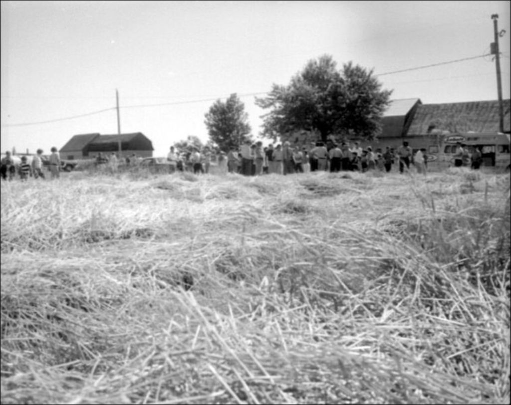 - Rassemblement dans une ferme. On peut voir notamment un groupe réuni devant des champs en culture. Événement photographié à l'intention de Marc Pouliot du ministère de l'Agriculture, Service de l'information