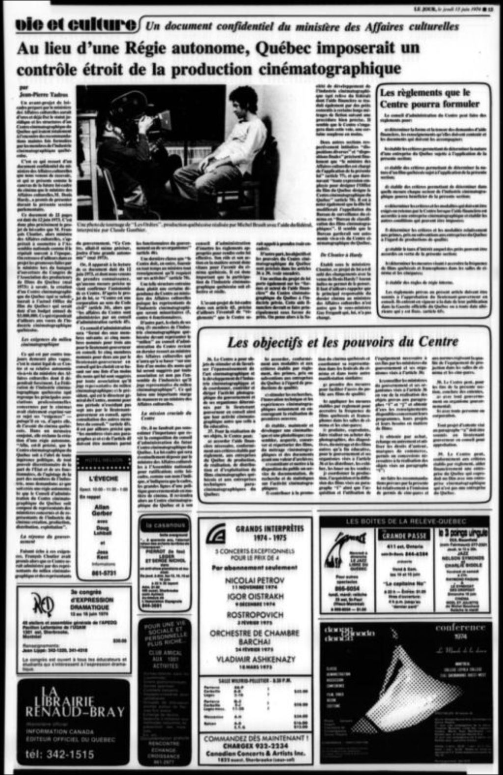 Page du 13 juin 1974 du journal «Le Jour» où il est question de la création d'un Centre cinématographique du Québec. L'information contenue dans l'article provient d'un document confidentiel du ministère des Affaires culturelles. Cliché commandé par Raymond-M. Léger du ministère des Affaires culturelles, Office du film du Québec