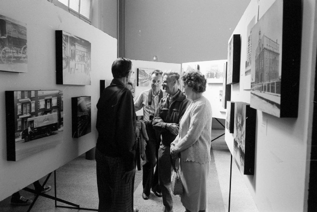 - Visiteurs discutant devant les photographies. Ces images ont été demandées par Raymond M. Léger du ministère des Affaires culturelles, Office du film du Québec