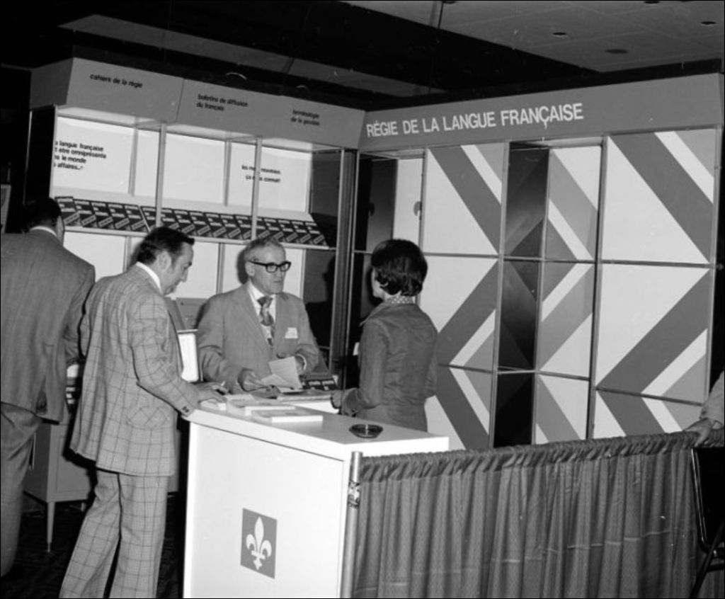 Kiosque de la Régie de la langue française lors du Congrès de la prévention des accidents (APAI). Hôtel Bonaventure, salle Westmount. Montréal, 1975, Archives nationales à Montréal, Fonds Ministère de la Culture et des Communications, (06M,E6,S7,SS1,D752516-752516), Claude Gosselin.