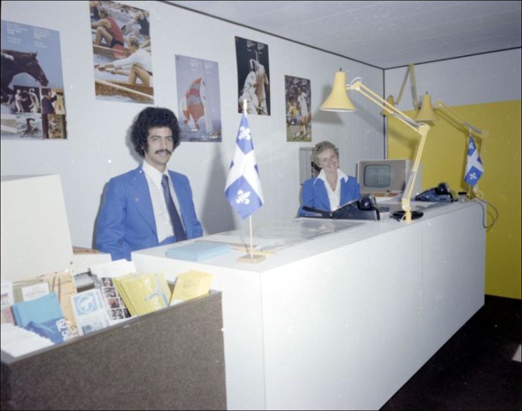 - Le personnel accueille les visiteurs aux comptoirs d'informations. Images créées pour Jacques Poirier du ministère du Tourisme, de la Chasse et de la Pêche