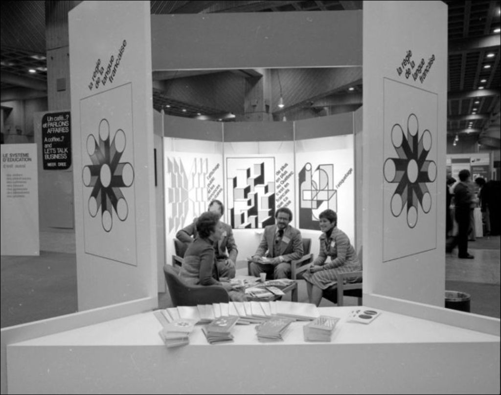 Kiosque de la Régie de la langue française. Place Bonaventure. Montréal, 1976, Archives nationales à Montréal, Fonds Ministère de la Culture et des Communications, (06M,E6,S7,SS1,D762561-762561), Henri Rémillard.