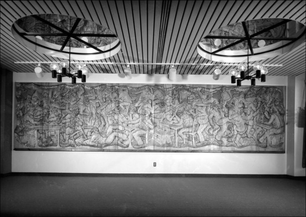 Murale en bois. Institut d'Hôtellerie. Montréal, 1977, Archives nationales à Montréal, Fonds Ministère de la Culture et des Communications, (06M,E6,S7,SS1,D772183-772183), Henri Rémillard.