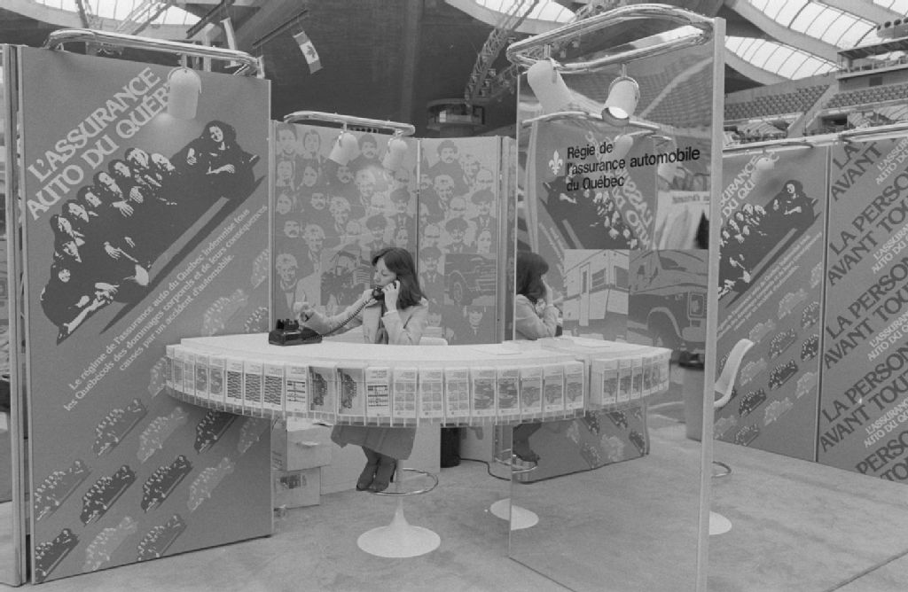 Kiosques de la Commission des accidents du travail et de la Régie de l'assurance-automobile du Québec au Salon de la femme au Vélodrome à Montréal, 1978, Archives nationales à Montréal, Fonds Ministère de la Culture et des Communications, (06M,E6,S7,SS1,D780507-780507), Adrien Hubert.