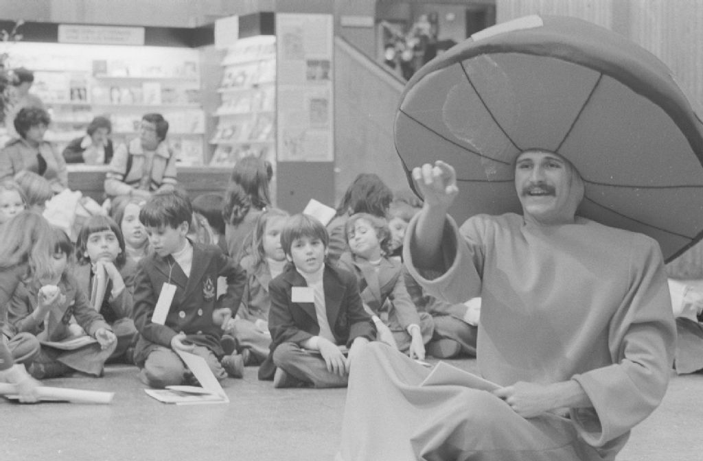 Adultes et enfants bouquinent dans les étalages des éditeurs exposants. Dossier produit pour Jacques Dion du ministère des Communications, Service de commercialisation