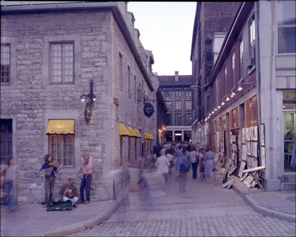 Bâtiments des restaurants Le Fripon et Le Saint-Amable en plus des artistes de la rue exposant leurs oeuvres. Clichés demandés par Paul Girard du ministère des Communications