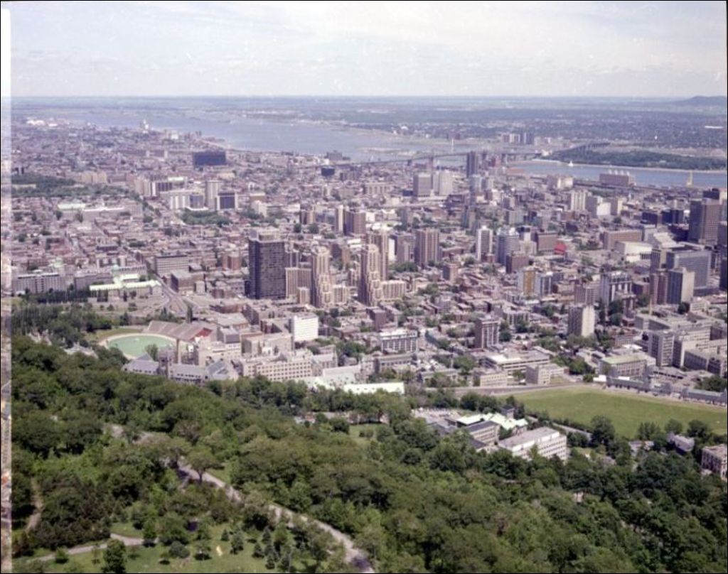 - La vue s'étend sur le centre-ouest de la ville, entre le Mont-Royal et la rive sud. Images commandées par Paul Girard du ministère des Communications
