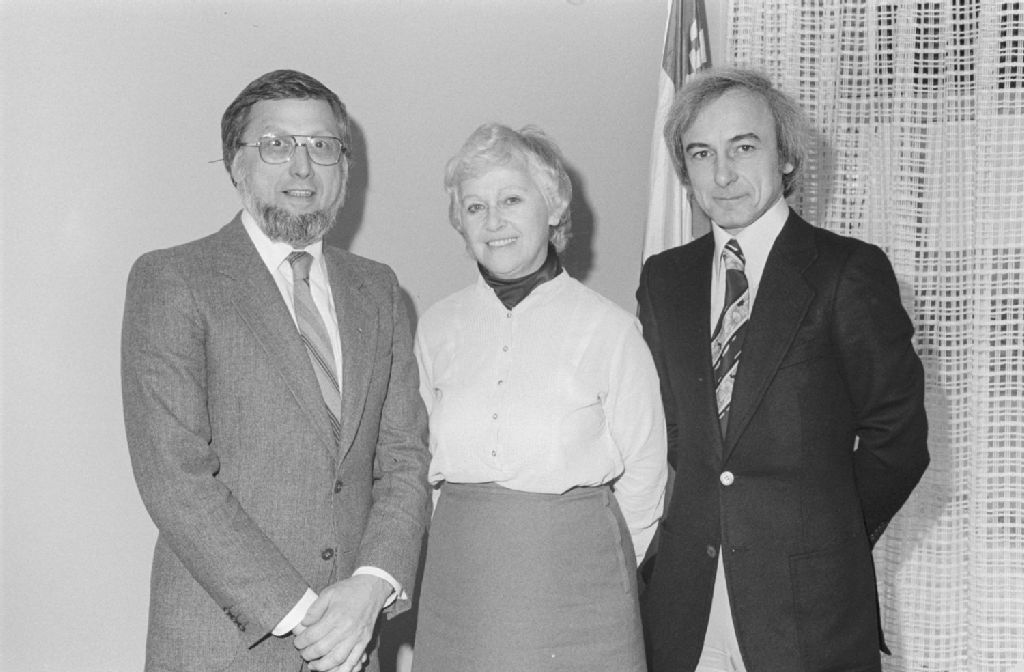Denis Lazure en compagnie de l'humoriste Yvon Deschamps et de Betty Russel dans le cadre de la Semaine du bénévolat. Bureau du ministre à Saint-Bruno