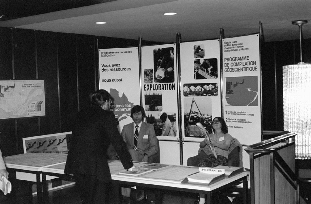 - Des préposés à l'information répondent aux questions des visiteurs au kiosque intitulé «Programme de compilation géoscientifique». Clichés demandés par Laurent Grenier du ministère des Richesses naturelles