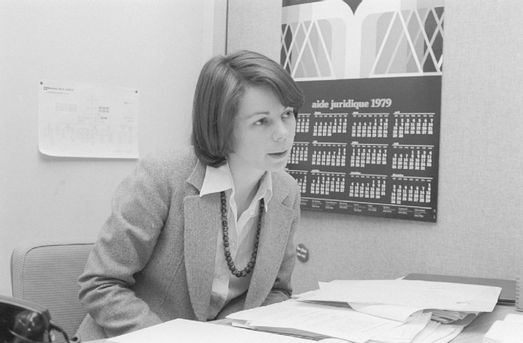 Employés au travail et discussion entre collègues au sujet d'un volume intitulé «Revue de droit pénal Publication générale de droit et de jurisprudence du Bureau des substituts du Procureur général du Québec». Clichés réalisés pour Yvon Lavoie du ministère de la Justice