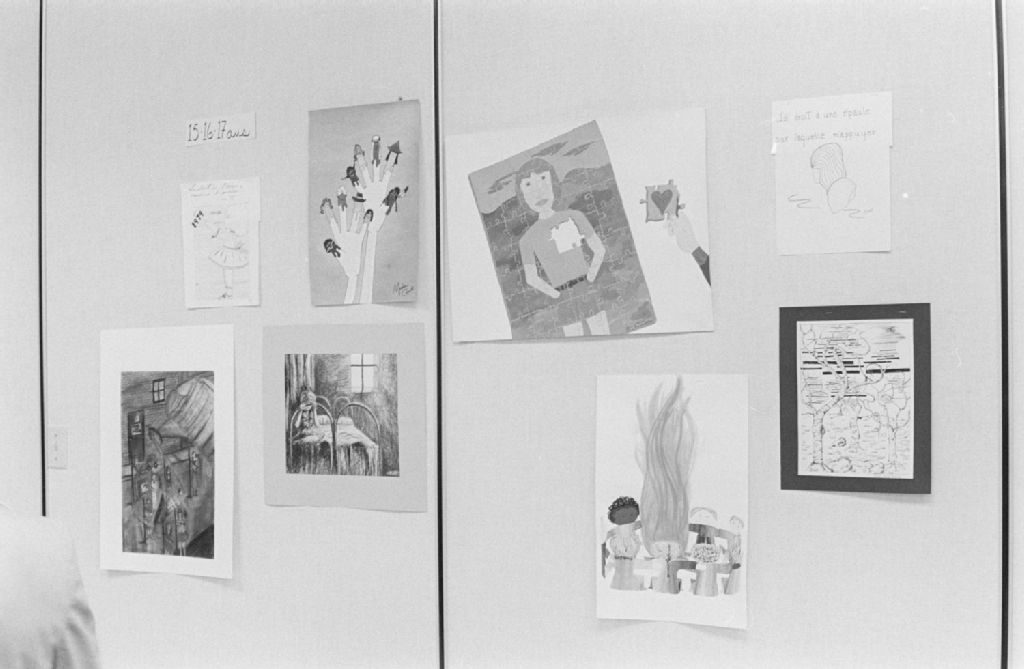 Conférence de presse lors de la remise des prix aux gagnants régionaux du concours de dessin du ministère de l'Éducation, Sainte-Dorothée. Laval