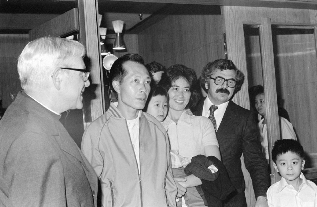 - On aperçoit Jacques Couture, ministre de l'Immigration, et monseigneur Paul Grégoire, évêque et cardinal de Montréal avec les membres de la famille vietnamienne. L'évènement a été photographié pour Nicole Geoffroy du ministère de l'Immigration, cabinet du ministre