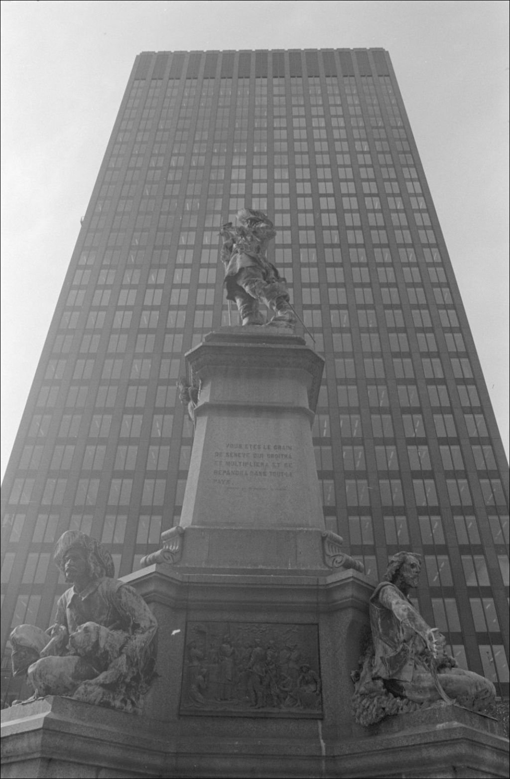 Dans le Vieux-Montréal, on remarque l'église Notre-Dame, la statue de Paul Chomedey de Maisonneuve et l'édifice de la Banque nationale. Images réalisées pour Paul Girard du ministère des Communications, Direction générale de l'édition