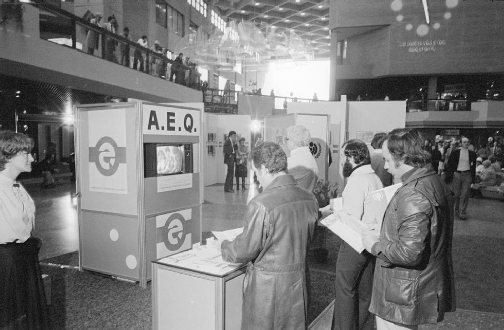 - Kiosque de l'Association d'éducation du Québec et du ministère de l'Éducation. Le dossier comprend aussi une vue d'ensemble de l'exposition photographiée pour Normand Gagnon du ministère des Communications, Service de l'identification visuelle
