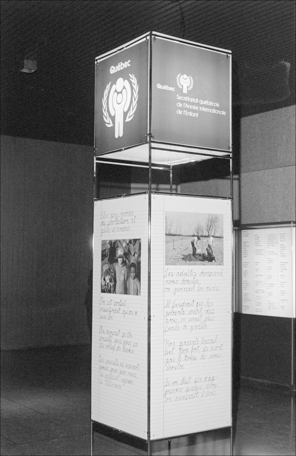 - Kiosque soulignant l'Année de l'enfant. Plaque décernée au ministère de la Justice. Employée au travail