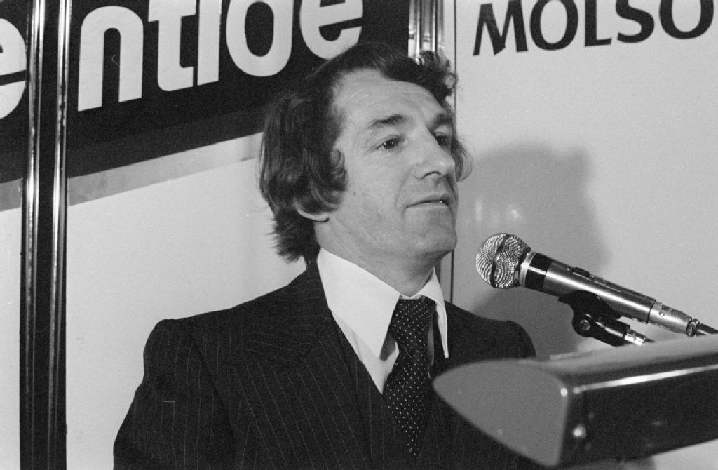 - Remise de la coupe Molson à Guy Lafleur par le ministre Lessard et les représentants de la Brasserie Molson, rue Notre-Dame est, Montréal