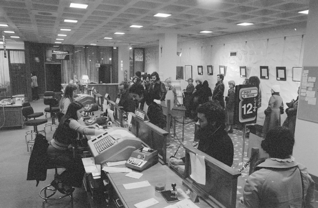 - File de clients et employées au travail. Ces photographies ont été commandées par Sylvie Hérard du ministère de l'Industrie, du Commerce et du Tourisme