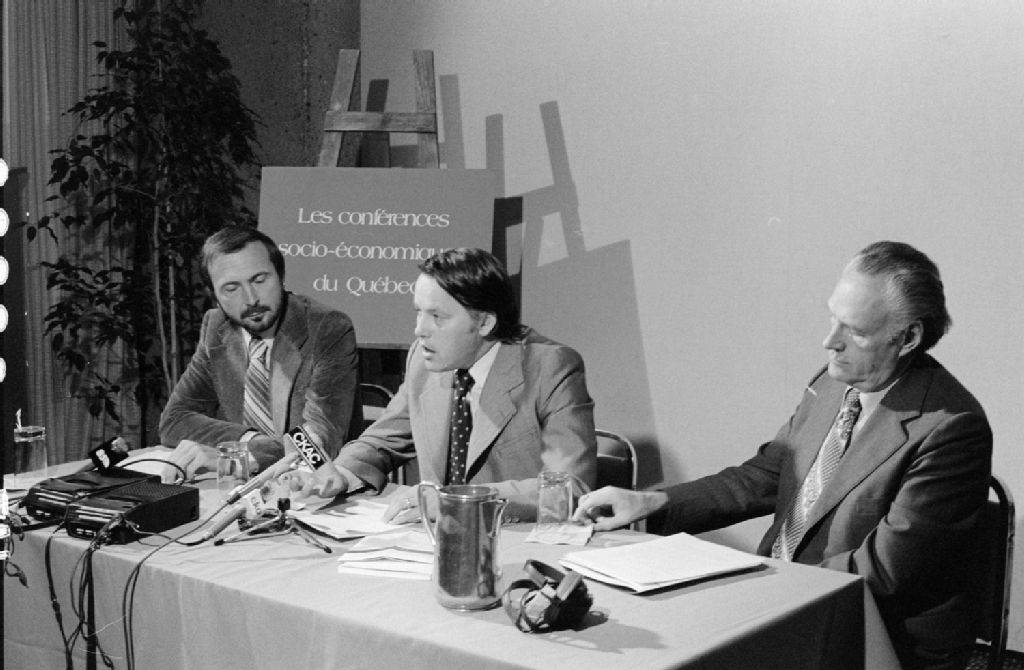 - Conférence de presse socio-économique avec Guy Joron, ministre des Consommateurs, Coopératives et Institutions financières, et Bernard Landry, ministre d'État au Développement économique. Salon des arts de l'hôtel Méridien. Montréal