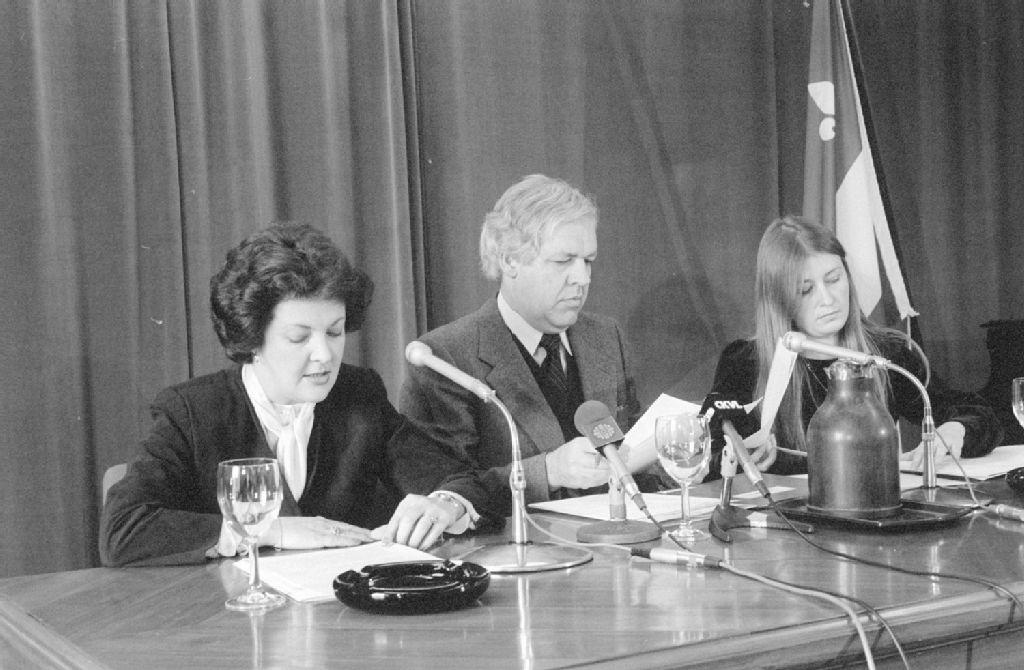 - Le bâtiment du 100, rue Notre-Dame s'appelle désormais «Centre administratif Ernest-Cormier» pour souligner l'importance de l'architecte, bâtisseur de cet immeuble de même que de l'Université de Montréal. Denis Vaugeois, ministre des Affaires culturelles et Jocelyne Ouellette, ministre des Travaux publics et des Approvisionnements accordent une conférence de presse. L'événement a été photographié pour Diane Pelletier-Meyland du ministère des Affaires culturelles