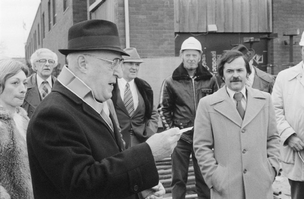 Première pelletée de terre de la Résidence Champagnat avec le député Jacques Beauséjour. Iberville, 1980, Archives nationales à Montréal, Fonds Ministère de la Culture et des Communications, (06M,E6,S7,SS1,D800123-800123), Adrien Hubert.