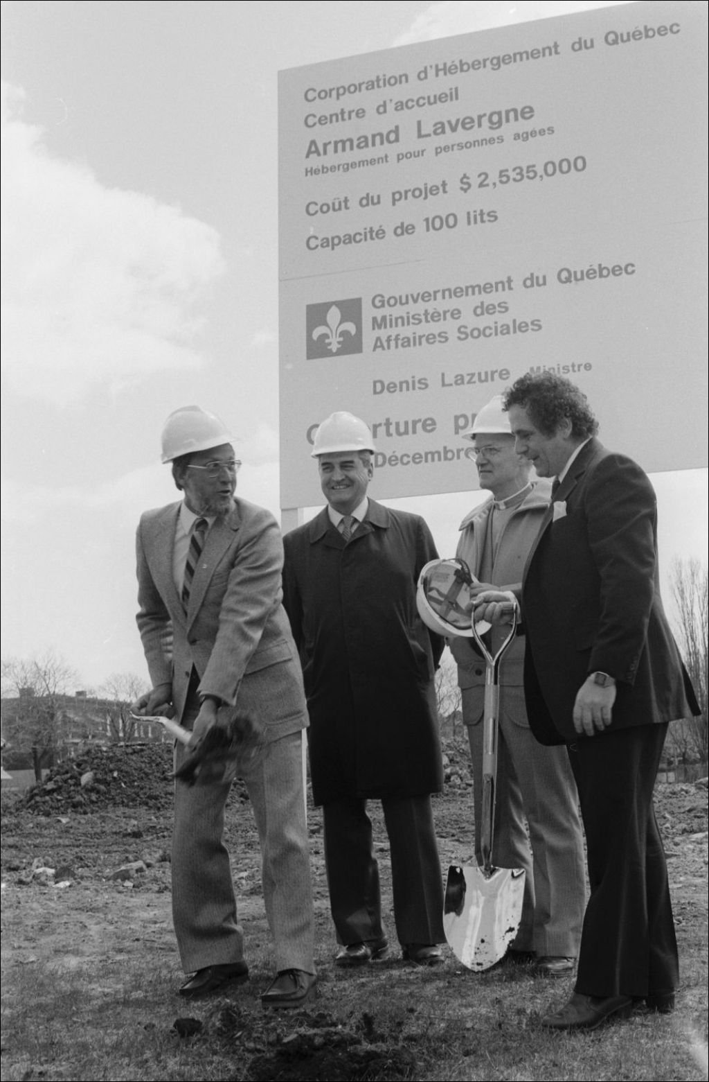 - Première pelletée de terre inaugurant le site de construction du Centre d'accueil Armand-Lavergne. Angle des rues Rachel et Chapleau, Montréal