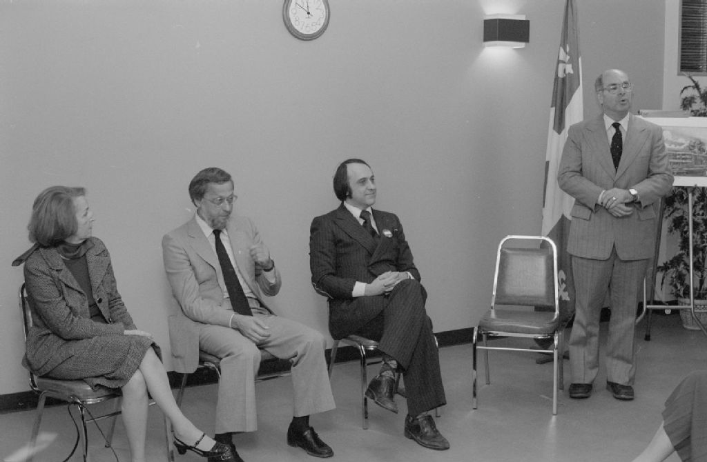 - La cérémonie inaugurant le site de construction du centre d'accueil se déroule en présence de Denis Lazure, ministre des Affaires sociales. Dossier produit pour Jeanne Lavallière du ministère des Affaires sociales