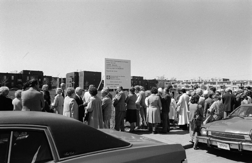 Première pelletée de terre du Centre d'accueil Judith-Jasmin. Angle des rues Sherbrooke et Joffre. Montréal, 1980, Archives nationales à Montréal, Fonds Ministère de la Culture et des Communications, (06M,E6,S7,SS1,D800211-800211), C. Gauthier.